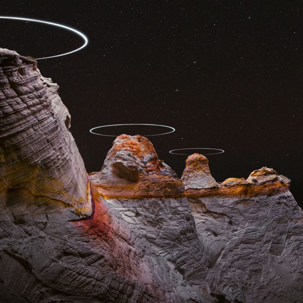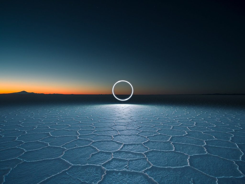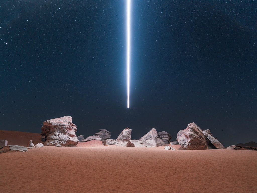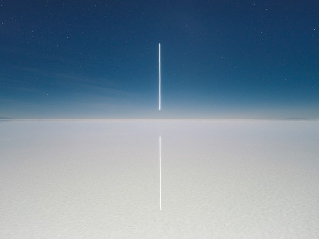 Je ziet fraai uitgelichte rotsen en geometrische vormen in de lucht. Foto’s gemaakt tijdens de projecten Lux Noctis en Aeroglyphs. Voor dat eerste project reisde Wu samen met camerafabrikant Phase One naar Bolivia.