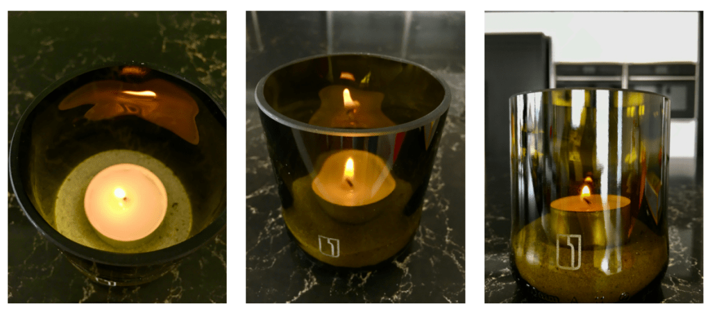 Jolien Van de Vliet (Botega): Op vakantie in Bali viel ons oog op de mooie waterglazen aan tafel. Na wat beter kijken zagen we dat het de onderkant was van een wijnfles. Dat vonden we zo leuk dat we direct op onderzoek zijn vertrokken. Eerst in Bali en daarna in België, vanop ons terras. Na enkele maanden uitzoeken hoe we tot een mooi en veilig glas kwamen, waren we gelanceerd.
