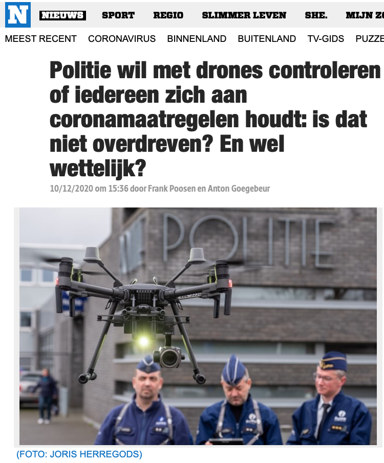 In Limburg en in West-Vlaanderen zijn politiekorpsen van plan om met drones te controleren of iedereen zich tijdens de eindejaarsfeesten aan de coronamaatregelen houdt en niet met heel de familie afspreekt. Privacy-experts schuwen de kritiek niet. “Er ontstaat een gluurmaatschappij die elk draagvlak onderuithaalt.”